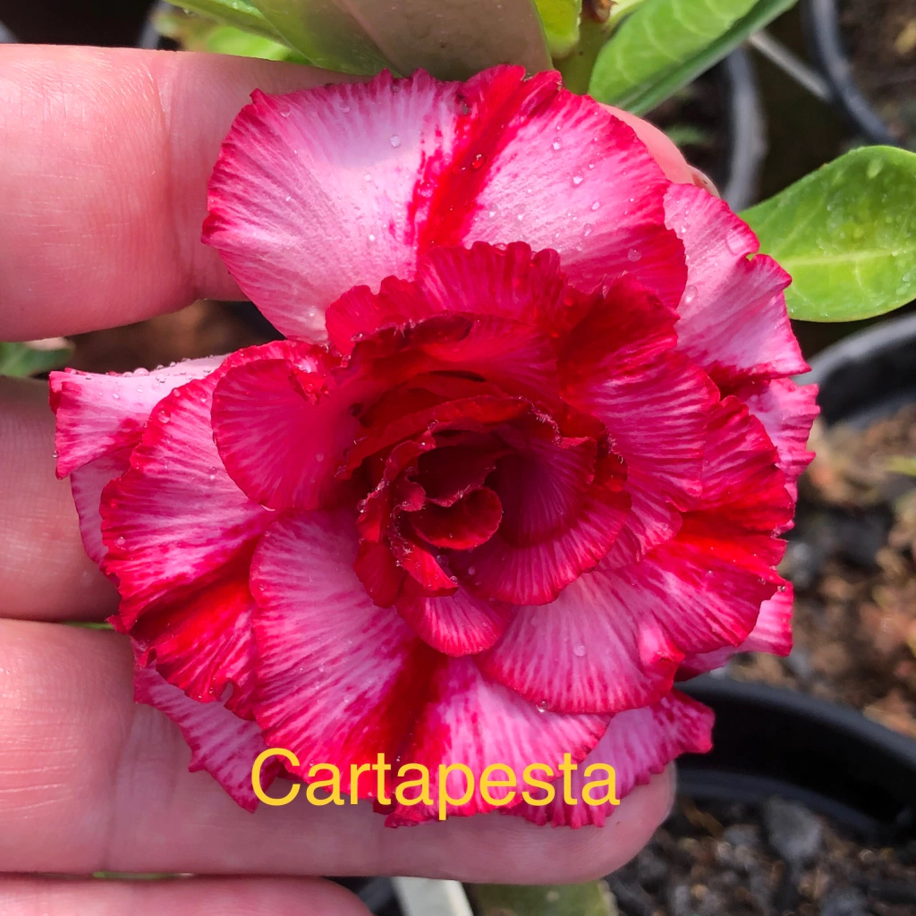 Rosa do Deserto CARTAPESTA, flor tripla, com tons vinho, vermelho e rosa. CARTAPESTA tem sua beleza nas pétalas manchadas, lembrando um papel machê.